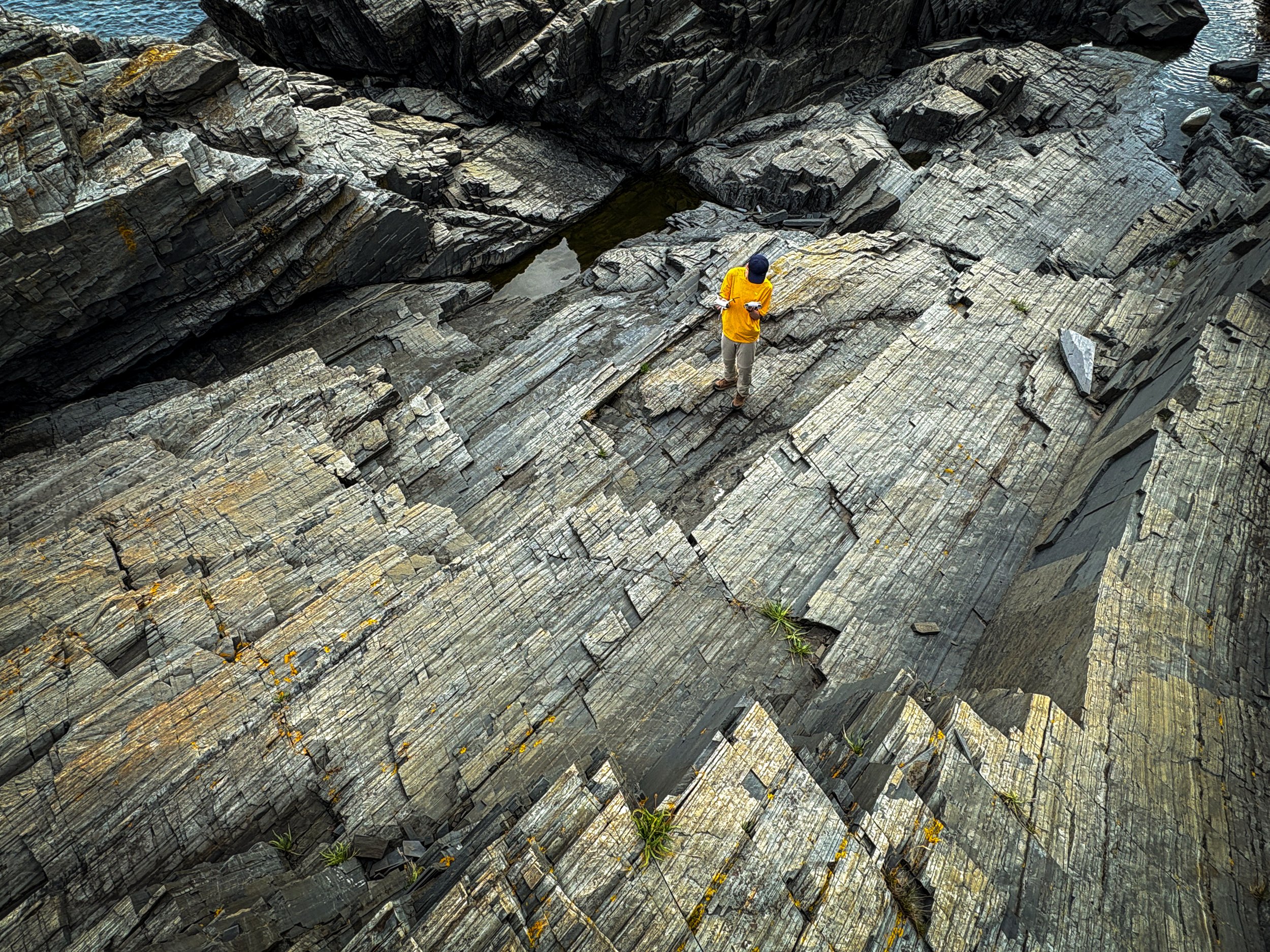 The Crocodile’s Foot — Folded Rocks Clawing into the Sea (off the coast of Cape Spear, NL). The coastal cliff face exposes a steeply inclined, tightly folded metasedimentary/or volcanic sequence truncated by marine erosion. Bedding planes show strong compressional deformation, producing tight to isoclinal fold geometry with well-preserved limbs and hinges. The oblique truncation of layers and the sharp inflection zones indicate significant compressional tectonics. Active wave erosion at the base has exploited structural discontinuities, forming incipient sea caves along the fold hinge-limb contact. The overall stepped, claw-like protrusion of the folded limbs jabbing into the surf evokes the form of a crocodile’s foot gripping the shoreline.