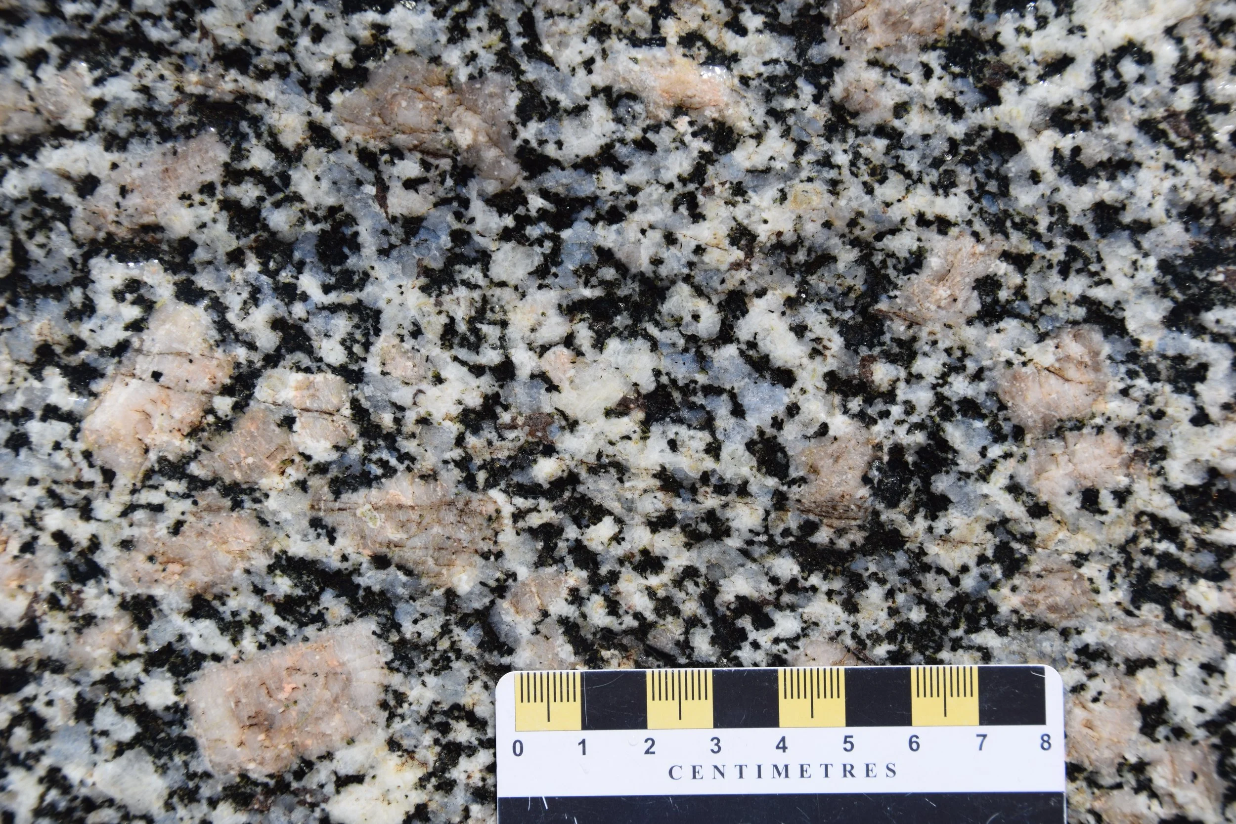 Blue_quartz – porphyritic granite in the Burgeo intrusive suite with pink K-feldspar phenocrysts, blue quartz, biotite (black) and titanite (dark brown).