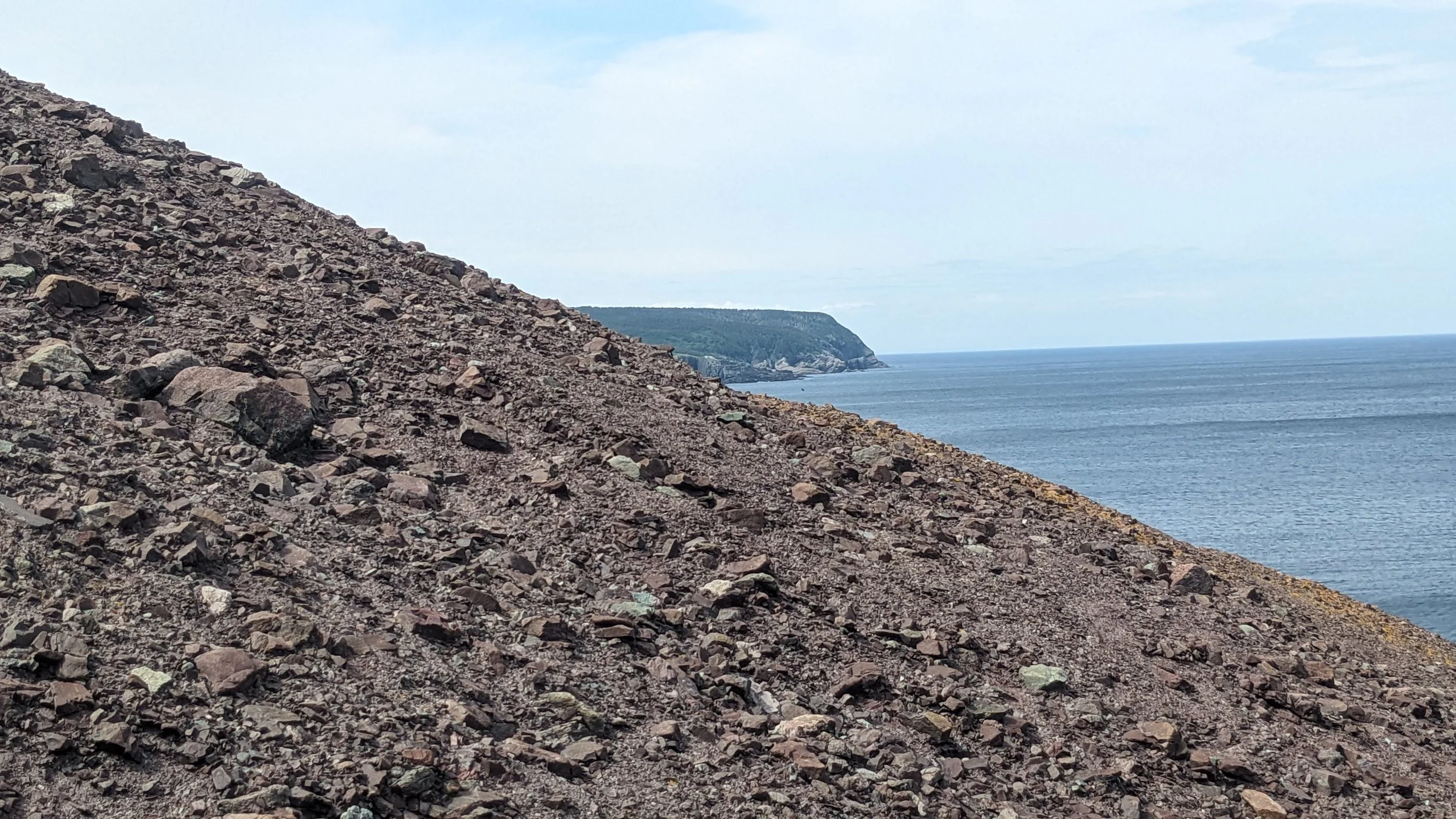 Side of a volcano? Scree slope? No, Ediacaran proximal alluvial fan facies – fully lithified – at Red Head, Flatrock, NL.
