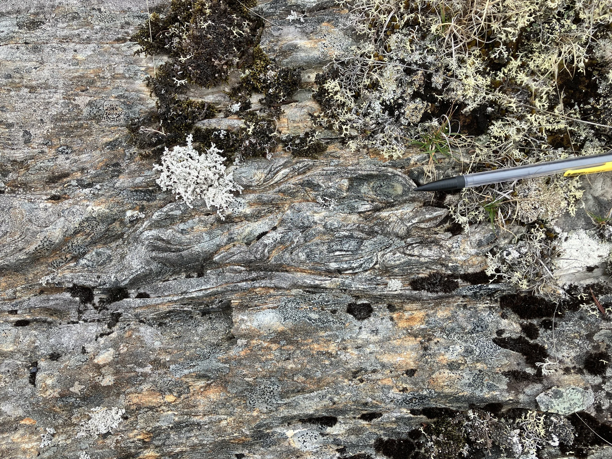 Polydeformed volcaniclastics around quartz vein, Florence Lake greenstone belt.
