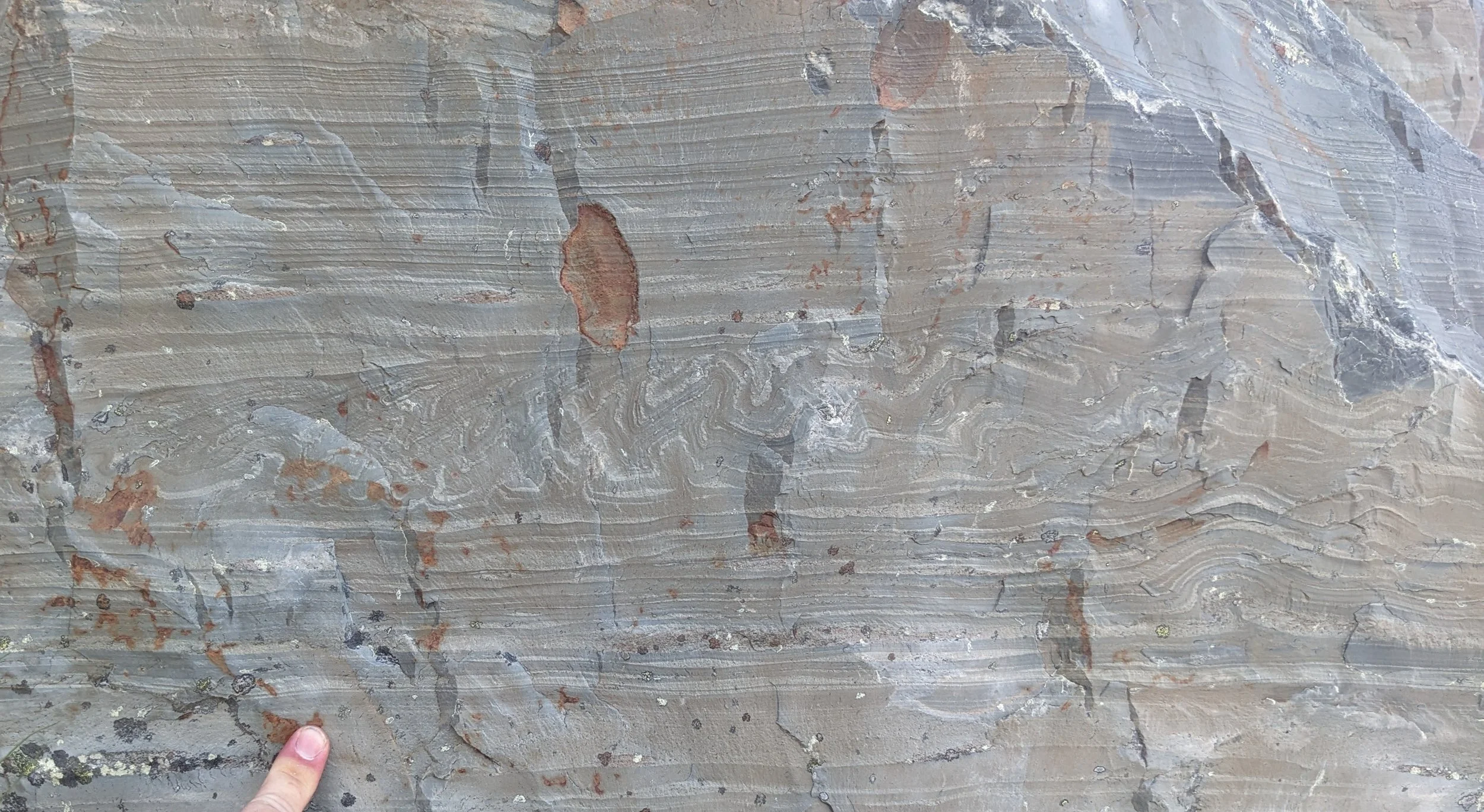 Soft-sediment deformation in shallow marine facies of the Ediacaran Grates Cove Member, Bay de Verde Group, Grates Cove, NL.