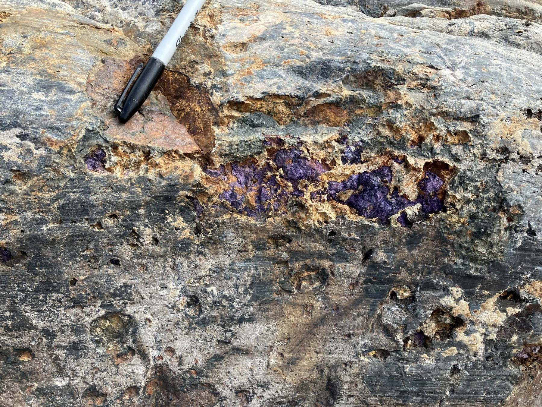 Zoned_mica – beautifully zoned mica in the Hydra LCT pegmatite dyke in southern Newfoundland. The mica has a green phengite core and a purple lepidolite rims. Also in the photo are orange garnet, black tourmaline, gray quartz, and gray albite.